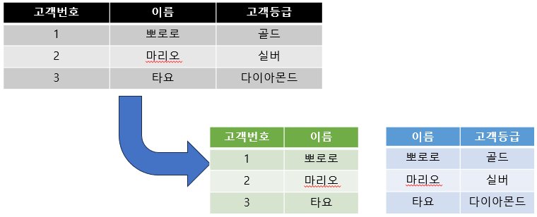 | 제2정규화 | 기본키가 2개 이상의 속성으로 이루어진 경우 부분 함수 종속성을 제거 (두 개를 분리해서 따로 테이블을 만듦) |