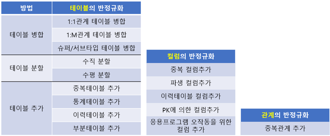 - 테이블 반정규화, 속성의 반정규화, 관계의 반정규화