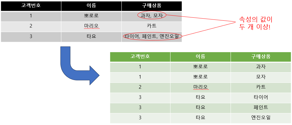 | 제1정규화 | - 테이블 내 속성의 원자성을 확보하는 단계 - 기본키를 설정 |