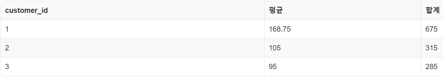 SELECT customer_id, avg(amount) 평균, sum(amount) 합계