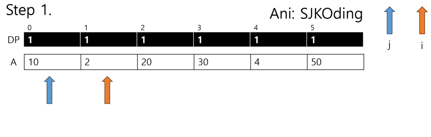 3. dp = [1]*N 으로 선언된 리스트에서 dp[i]가 dp[j+1]보다 작다면 dp[i]를 dp[j]+1로 치환한다.