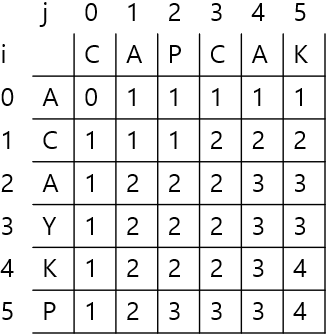 첫 번째 문자열의 부분 수열 "A"를 두 번째 문자열의 부분수열인 "C", "CA", "CAP", 'CAPC", "CAPCA", "CAPCAK"의 순서로 모두 비교한다. 일단 비교 대상이 "A" 한 글자이므로 최대 공통 부분수열 길이 1을 초과할 수 없다. 두 번째 문자열의 부분수열안에 "A"가 포함되어있으면 그때의 최장길이는 1인것이다. 정정, 첫 번째 문자열의 부분수열이 두 번째 문자열의 부분 수열에 포함여부를 따지는게 아니라, 양 방향으로 따져야한다. i=1일 경우에서 부가설명한다. 따라서 다음과 같은 결과를 가져온다.