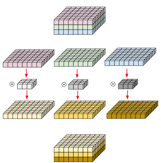 그림을 보면 R, G, B채널의 Color Image가 있다고 가정할 때, 각 채널마다 독립적으로 각기 다른 필터를 적용시켜 새로운 feature map을 만들어낸다. 기존에는 각 채널마다 독립적으로 진행하지 않고, 하나의 필터로 모든 채널의 연산을 수행한 것과 차이점이 있다.