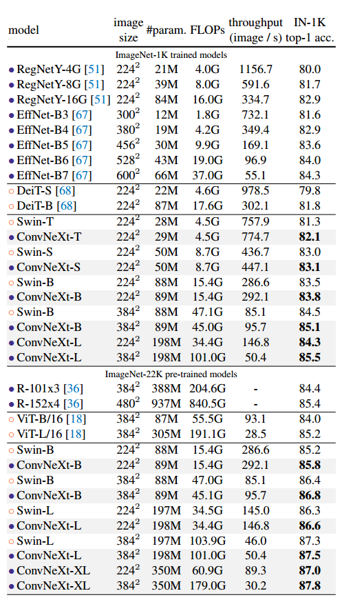 위 실험 테이블을 보면 유사한 FLOPs를 보면 거의 ConvNeXt의 성능이 가장 높은 것을 볼 수 있다. 또한 충분한 데이터셋에서도 Swin Transformer의 성능을 넘어섰다는 건, inductive bias가 크더라도 큰 데이터셋에 대한 성능이 떨어지지 않는다는 것을 위의 표에서 보여주고있다.