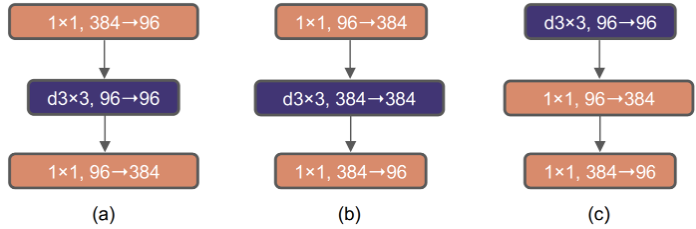 따라서 이 아이디어를 적용해 위 그림의 (c)에서 (b)로의 구성으로 변경했으며, 채널이 확장되었으므로 Depthwise convolution 레이어의 FLOPs가 증가했음에도 downsampling residual block에서 상당한 FLOPs감소를 보이므로 전체 네트워크의 FLOPs를 4.6G로 줄였다. 또한 성능도 미세하게 향상되면서 연산량과 성능 두마리 토끼를 모두 잡았다.