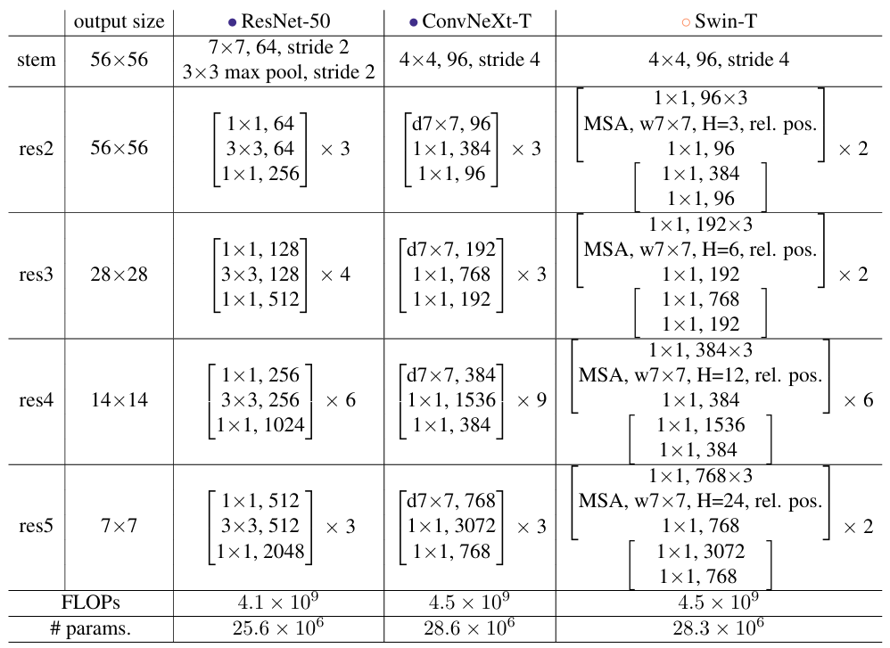 여하간 Depthwise convolution의 사용으로 연산량을 줄이지만 accuracy도 줄여지기 때문에 ResNeXt에서 제안된 전략을 따라 네트워크의 width를 Swin-T와 같은 채널 수인 96으로 증가(64 to 96)시킨다.