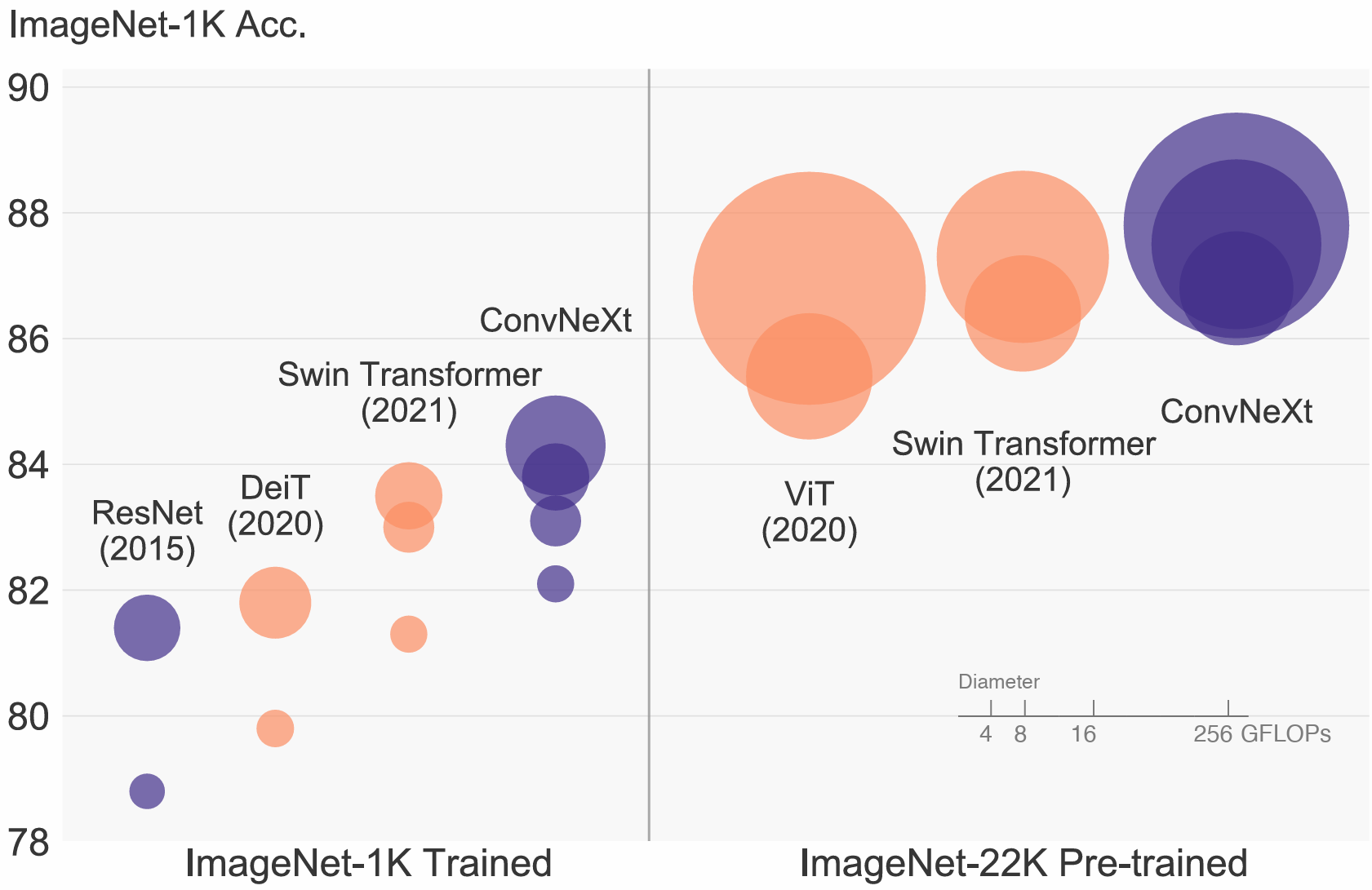 계층적인 Transformers (예: Swin Transformers)가 다시 ConvNet의 여러 가정을 도입함으로써 Transformers를 일반 비전 백본으로 실용적으로 만들고 다양한 비전 작업에서 뛰어난 성능을 보여줬다. 즉, Transformer에도 CNN의 일부 기법과 가정을 도입하여 성능향상을 이끌어냈다는 것이다. Transformer, CNN이 서로 도움을 주고있다.