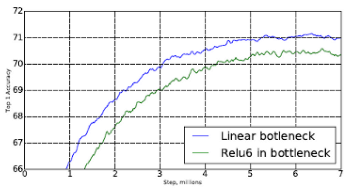 MobileNet2의 저자는 manifold가 ReLU를 통과하고 나서도 입력값이 양수로 남아있다면, 결국 identity matrix(0과 1로 이루어진 단위행렬)와 곱해진 단순한 선형변환(linear trasnformation)과 같다고 볼 수 있다고 한다. 따라서, ReLU를 사용하지 않고 linear transformation 역할을 하는 linear bottleneck layer를 만들어서 차원은 줄이면서 주요정보는 유지하자는 컨셉이다. 그리고 여기서 Inverted bottleneck구조가 사용되었고 이때부터 유명해지고 널리 사용되었다.