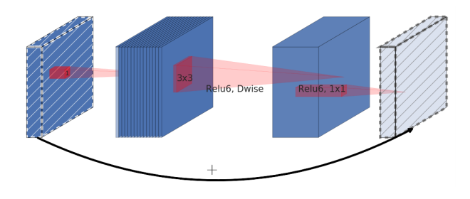 일반적인 bottleneck구조와 정반대로 구성되어있다. 차원을 늘린 후 피처추출을하고 다시 줄여 skip connection을 진행하는 구조이다. 저자는 저차원의 layer에 주요 정보가 압축되어있다고 가정한 후 이를 skip connection으로 사용함으로써 메모리 사용량을 줄이기 위해 위 구조를 사용한다. 또한 채널을 확장하고 standard convolution이 아닌 depthwise convolution을 사용하여 연산량을 줄였다.