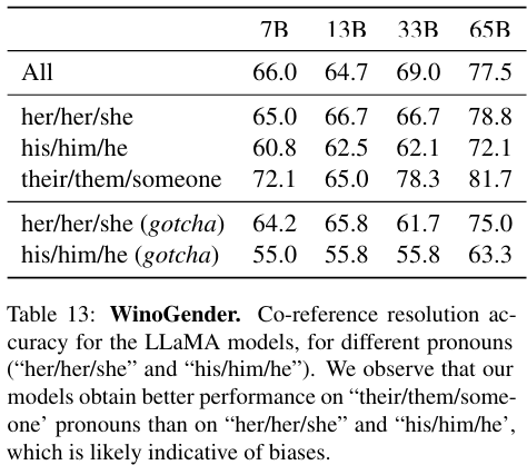 표 13을 보면 LLaMA는 gotcha예시에서 많은 오류를 범하고, 이는 모델이 성별과 직업과 관련된 사회적인 bias를 포착한다는 것을 명확히 보여준다.