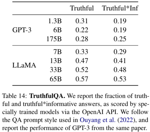 해당 벤치마크는 Misinformation을 생성할 위험을 평가할 수 있고 질문들은 다양한 스타일, 38개의 범주를 포괄하고 대립적으로 설계되었다. 이후 [truthful models]과 [truthful and informative]의 교집합에 대한 성능을 보고한다. 표 14에서 LLaMA가 GPT-3와 비교할 때 두 카테고리에서 모두 더 높은 점수를 받았지만, 정답률은 여전히 낮아 모델이 잘못된 답변을 이루어낼 가능성이 높다는 것을 보여준다.