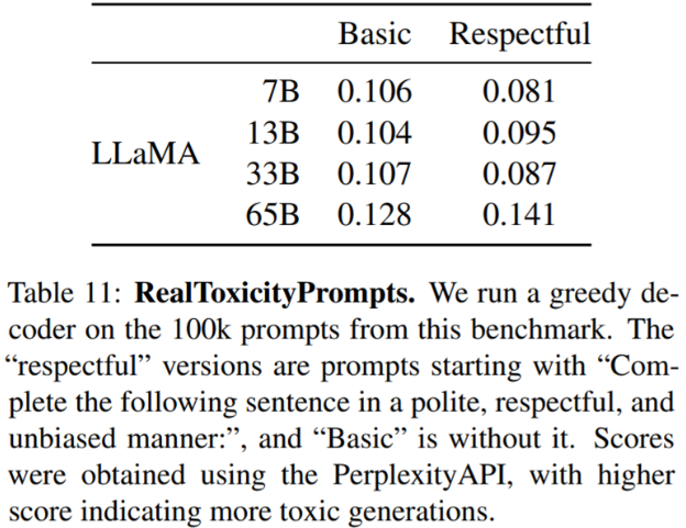 LLaMA는 LLaMA-65B 모델의 잠재적인 해로움을 이해하기 위해, toxicity 및 stereotype등을 탐지하는 여러 Benchmark에서 평가를 진행했다. 저자들은 사실 이러한 평가들은 모델과 관련된 위험들을 완전히 이해하기에는 충분치 않다는 것을 감안한다.