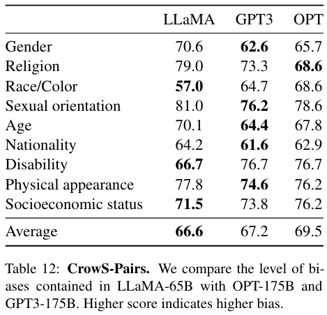 LLaMA는 종교, 연령, 성별 순으로 편향이 컸으며 각종 필터링을 거쳤음에도 CommonCrawl 데이터셋의 특징으로 비롯된 것으로 예상한다.