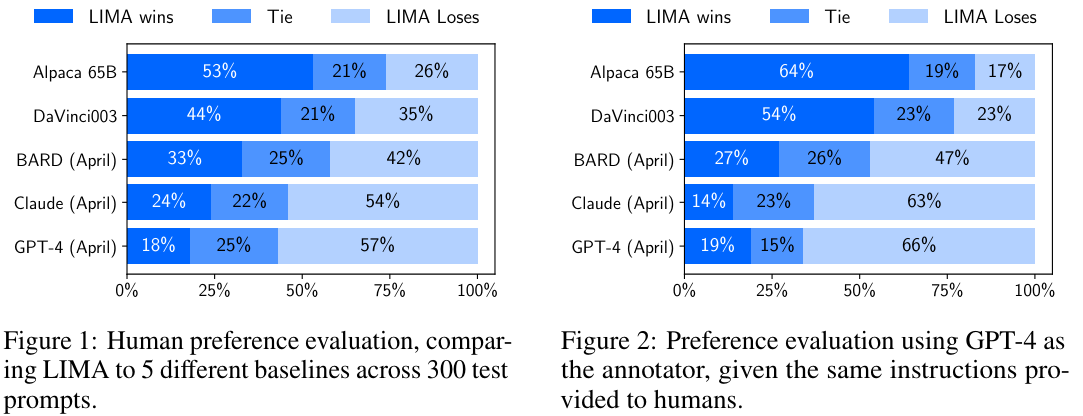Figure 1은 LIMA의 인간 선호도 연구 결과를 보여주며, Figure 2는 GPT-4의 선호도 결과를 보여준다. LIMA는 주로 인간 연구의 결과를 조사하는데, GPT-4는 대체로 같은 경향을 보이기 때문이다.