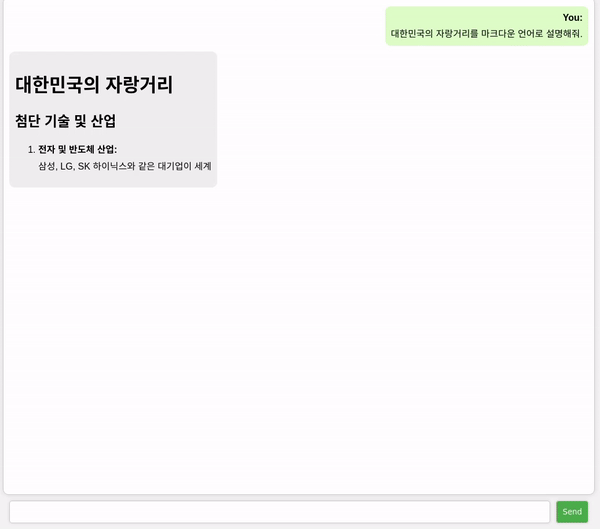 LLM 모델을 기능에 따라 파인튜닝 시켜 챗봇 시스템을 구축하고, 웹 개발팀에 넘기기 전 LLM의 실시간 스트리밍 출력과, 출력이 Markdown언어일 때 ChatGPT처럼 실시간으로 Markdown문법이 적용되게 끔 구현해보았다.
